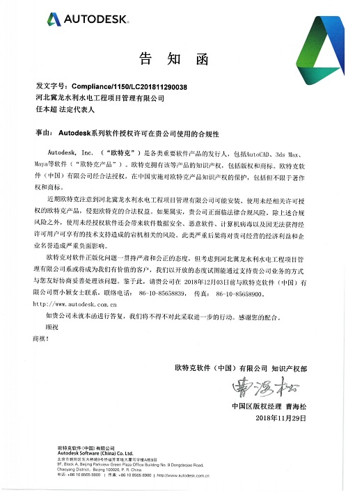 近期我公司收到以下告知函,請各駐地人員自查自糾,是否有安裝、使用未經(jīng)相關(guān)許可、授權(quán)的歐特克產(chǎn)品的行為,如有上述行為者盡快做相應(yīng)處理。請大家互相告知。